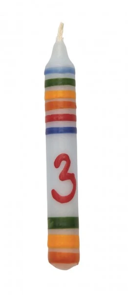 Eine Kerze mit der Zahl 3, Typ Hellblau in schönen lebendigen Farben. Die tolle kleine Kerze ist wunderbar fröhlich gestaltet und begeistert mit schönen Kontrasten.