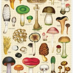 Vintage Puzzle Mushrooms ist ein wunderschönes Retro Pilz-Puzzle. Es sieht aus wie eine sehr alte Bestimmungstafel aus einer Schule oder einem alten Biologischen Institut.