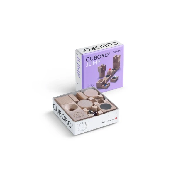 Mittels der Trampoline aus dem Extra Set Jump, lassen sich raffinierte Sprungpassagen in die Cuboro Kugelbahn integrieren.