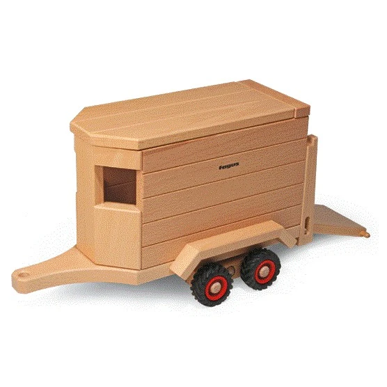 Der Pferdeanhänger von Fagus besteht aus Buchenholz. Die Rückwand ist abklappbar und das Dach ist abnehmbar. Der Anhänger ist 32 cm lang.