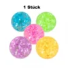 Schicker farbiger Flummi mit Sternchen. Wird der Flummi vorher im Licht aufgeladen, leuchtet er danach auch noch im Dunkeln!