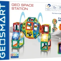 Mit 70 Teilen ist das GeoSmart  Magnetbauset GeoSpace Station eines der großen Spezialsets, das einem eine Unzahl an Baumöglichkeiten bietet. Die 5 verschiedenen GeoSmart-Formen, Vierecke, Dreiecke, Rechtecke, Trapeze und spitzwinklige Dreiecke, können die „abgespacesten“ Raumstationen ergeben. Die 2 LED Lichteinsätze und die 2 Drehscheiben ermöglichen zusätzliche Besonderheiten und Innovationen. Die 8 wunderschön leuchtenden Farben schillern dank ihrer Transparenz im Licht und lassen die Gebilde noch ein bisschen unwirklicher erscheinen.