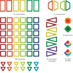 • 70 Teile (36 Vierecke, 12 Dreiecke, 6 Rechtecke, 4 Trapeze, 8 spitzwinklige Dreiecke, 2 LED Lichteinsätze, 2 Drehscheiben)