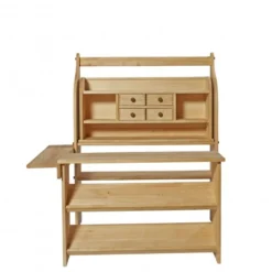 Zum Kaufladen gehören das rückwärtige Regal mit vier herausziehbaren Schubladen, der Verkaufstresen vorn und einem seitlichen Verbindungsbrett als zusätzlicher Abstellfläche. Es kann rechts oder links montiert werden. 1,10 m breit ist der stabile Laden und die Rückwand ungefähr gleich hoch. In der Tiefe misst er maximal 90cm, ist aber 2-stufig verstellbar, wenn der Laden mal etwas kleiner sein soll. Bitte beachten Sie, dass im Lieferumfang keine Dekoration oder weitere Ladeneinrichtung (Kasse etc.) enthalten ist, die muss noch dazu bestellt werden.