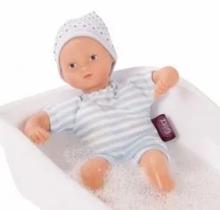 Mini Aquinis von Götz sind kleine Badepuppen, hier mit einem blau gestreiften Stoffkörper. Die spezielle Füllung aus Kügelchen lässt die Puppe nicht untergehen. Nach dem Bad trocknet die Puppe an der Luft.