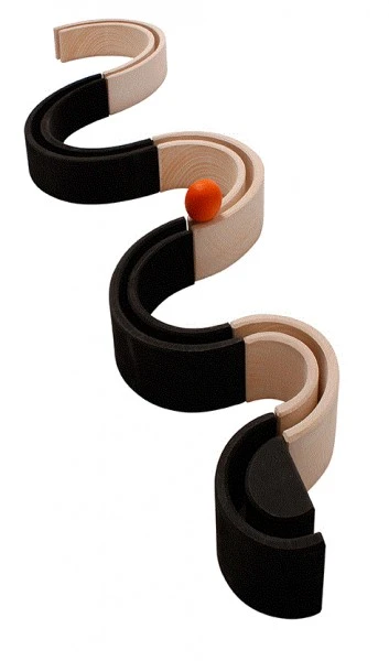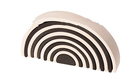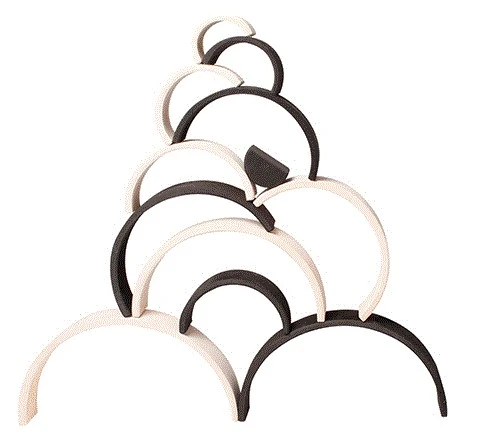 Holzbögen in Schwarz und Weiß zum Spielen und Dekorieren. 12 halbrunde Holzbögen passen genau ineinander. Das Monochrom-Bogenspiel von Grimms ist gestapelt 38 cm lang und 18 cm hoch.