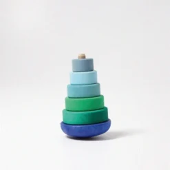 Steckspiele wie dieser kleine Scheibenturm in blau/grün Tönen bereiten kleinen Kindern viel Freude. Die ganz Kleinen bauen den Turm auseinander und wieder zusammen, dabei wird die Auge-Hand-Koordination, die Feinmotorik sowie die Farb- und Größenwahrnehmung geschult. Das besondere hier ist der Runde Rumpf, der sich immer wieder aufstellt wenn er gekippt wird. Ein wackliger Spaß aus Buchenholz.