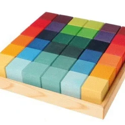 Ein ganz grundlegender Baustein ist ein Holzwürfel mit Kantenlänge 4cm. In diesem schönen Holz-Bausteinset Viereck von Grimm´s Spiel- und Holzdesign bekommen Sie 36 solcher Würfel in wunderschönen Regenbogenfarben. Angeordnet sind sie auf einem Holztablett, so können sie auch als Legespiel oder Puzzle genutzt werden.