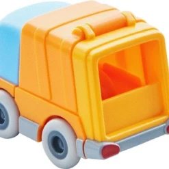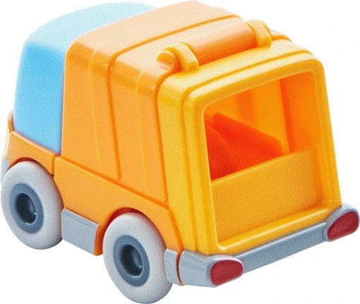 Bei dem Müllauto der Reihe Kullerbü von Haba lässt sich sogar die Heckklappe zum Laden öffnen, super! Der Müllwagen hat einen Schwungmotor und fährt nach einem guten Anschubser ein ganzes Stück alleine weiter.