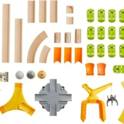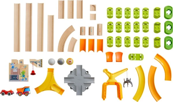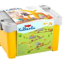 Die Haba Kullerbü Spielbahn Freie Bahn Verladekran wird kleine Baustellen-Fans und alle Kinder, die rollenden Kugel-Spaß mögen, sofort begeistern. Eine große Kiste mit vielen Bauteilen, bei der auch der Deckel der Kiste als Bahnteil mit verbaut werden kann – super! Das Besondere an den Spielbahnen ist, dass sowohl Kugeln als auch die Autos auf den Bahnen fahren können.