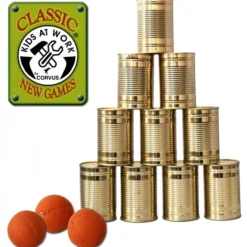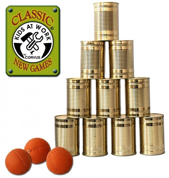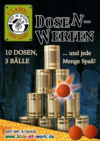 Diese Variante von Kids At Work ist besonders dekorativ und nostalgisch, da hier echte geschlossene Lebensmitteldosen verwendet werden. Das macht nochmal deutlich, dass Dosenwerfen eine ganz alte klassische Art des Kinderspiels ist, ein Evergreen. Die Dosen verbeulen auch nach und nach, das gehört dazu.
