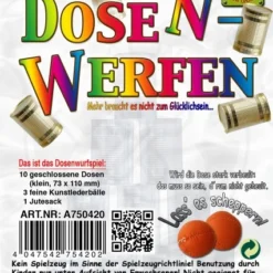 Die 10 Dosen werden ordentlich zum Stapel aufgeschichtet, die Wurflinie festgelegt und dann wird abgeräumt. Hier darf es mal richtig scheppern und der ganze Dampf abgelassen werden! 3 richtig gut griffige Bälle sind auch schon mit dabei.