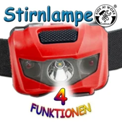 Rote LED-Stirnlampe mit schwarzem Stretchband. So bleiben beim Camping und anderen Tätigkeiten im Dunkeln die Hände frei! Die Lampe hat 4 Leuchtfunktionen, die einfach über einen Schalter geregelt werden. • 3xAAA Batterien werden benötigt (sind nicht enthalten) • 1Watt, 90Lumen IPX4 • Sicherheitshinweise beachten Kein Spielzeug im Sinne der Spielzeugrichtlinie.