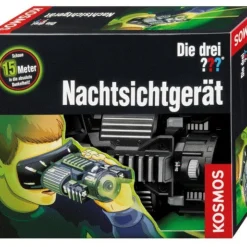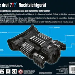Mit diesem Nachtsichtgerät kann man bis zu 15 Metern in die Dunkelheit sehen. Die Detektive bleiben bei ihrer Recherche unentdeckt, da der Lichtstrahl dank Infrarot-Technologie unsichtbar ist. Ein Hightech-Gerät, das allen „Die drei ???“-Fans und jungen Hobby-Detektiven garantiert Spaß macht.