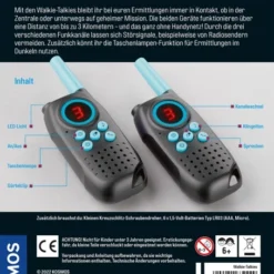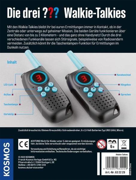 Aus der drei Fragezeichen-Reihe von Kosmos gibt es dieses geniales Funkgeräte-Set für alle Nachwuchsdetektive: Die drei ??? Walkie-Talkies. In welcher Straße wurde die verdächtige Person zuletzt gesehen? Welche Farbe hat das Fluchtfahrzeug? Wurde der Tatort abgeriegelt? Mit dem Walkie-Talkie-Set ausgestattet begeben sich die Kinder wie echte Detektive auf Spurensuche, sammeln wichtige Hinweise und tauschen sich über die Funkgeräte aus. Bis zu drei Kilometer können die Spürnasen voneinander entfernt sein – dank der drei Kanäle ist die direkte Kommunikation immer garantiert. Geniales Extra: die integrierte Taschenlampe. • Inhalt: Set aus 2 Walkie Talkies mit 3 Funkkanälen zum Wechseln, Gürtelclip und Taschenlampe, illustriertes Anleitungsblatt • Empfohlen ab 8 Jahren • Zusätzlich wird benötigt: 6 x 1,5-Volt-Batterie Typ LR03 (AAA, Micro) Die EU-Konformitätserklärung gemäß Richtlinie 2014/53/EU für den Funkanlagentyp 632229 Walkie Talkie finden Sie auf unserer Homepage unter: https://www.kosmos.de/content/service/entsorgung-und-sicherheit/