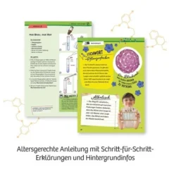 Die jungen ForscherInnen beobachten das Entstehen von Kohlenstoffdioxid, spüren mit Indikatorlösung Säuren und Basen auf, untersuchen, was es mit Seife und Duschgel auf sich hat, und können sogar einfache elektrochemische Versuche durchführen. Alles Schritt für Schritt und altersgerecht im Anleitungsheft des KOSMOS Experimentierkastens erklärt.