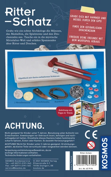 Mit Hammer, Meißel und Schwämmchen werden beim Kosmos Experimentierkasten Ritter-Schatz sagenhafte Schätze ausgegraben. Metall-Münzen, Drachenzahn und Medaillon erinnern an das Mittelalter, sodass die Ausgrabung zu einem spannenden Rollenspiel wird. Mit der beiliegenden Schnur dem Drachenzahn lässt sich eine tolle Kette basteln und mit einem Wurfspiel lässt es sich prima die Zeit vertreiben.