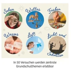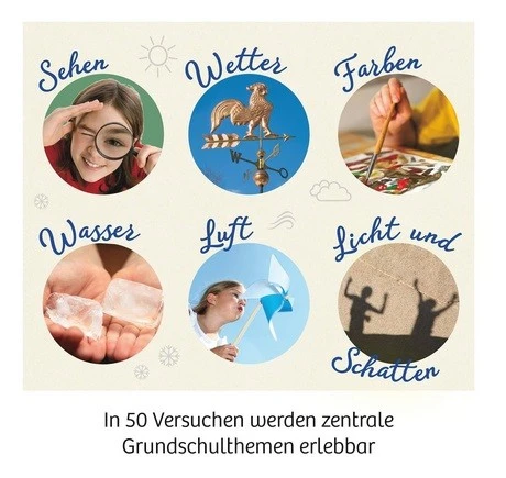 Die über 50 Versuche rund um Wasser, Luft, Sinne und mehr sind am schulischen Lehrplan orientiert und ermöglichen selbstständiges, nachhaltiges Experimentieren und Lernen. Licht und Schatten, Luft und Wasser, Hören und Sehen! Es gibt so viel zu entdecken. Alle Versuche sind auf den Wissensstand der 1./2. Klasse zugeschnitten.Es wird gebastelt, gemischt, beobachtet und verstanden – denn Kinder lernen am besten, wenn sie Pipette und Co. direkt selbst in die Hand nehmen.