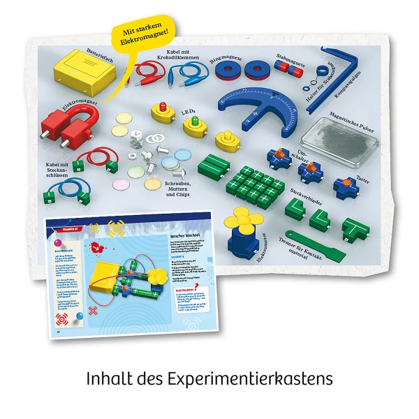 • Inhalt: Batteriekasten, Elektromagnet, Elektromotor. Schalter, Taster, Lämpchen, Box mit Eisenpulver, Ringmagnete, Rundmagnete, Ständer und Magnetaufhängung für Kompassbau, Kleinteile mit Eisen, Kabel mit Stecker und Krokodilklemmen und Kontaktelemente