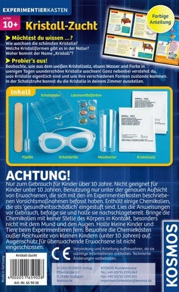 Achtung! Nur zum Gebrauch für Kinder über 10 Jahre. Benutzung nur unter der genauen Aufsicht von Erwachsenen, die sich mit den im Experimentierkasten beschriebenen Vorsichtsmaßnahmen befasst haben. Enthält einige Chemikalien, die als „gesundheitsschädlich“ eingestuft sind. Anweisungen vor Gebrauch lesen und befolgen. Körperkontakt mit den Chemikalien vermeiden. Chemiekästen außerhalb der Reichweite von kleinen Kindern und Tieren anwenden und aufbewahren. Der Augenschutz für Überwachende Eltern ist nicht enthalten.