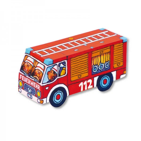 Die ausgestanzten Bögen sind schon gestaltet und mit dem Feuerwehrauto bedruckt. Es muß noch gefaltet und verhakt werden, dann entsteht ein cooles Fahrzeug. Es sind weder Schere noch Klebstoff nötig.