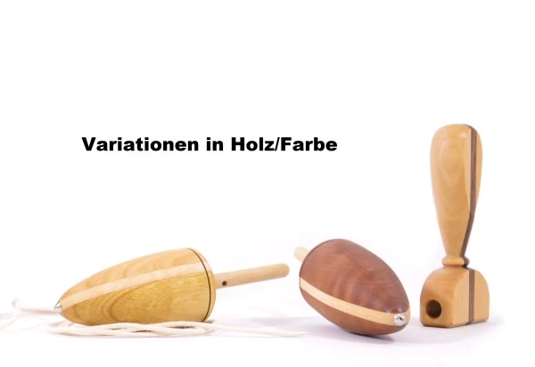 Der tolle Holzkreisel Goliath von der Kreiselmanufaktur Mader ist eine Herausforderung: Er hat die schwierige Donnerkeil-Form! Kreisel-Profis schaffen es vielleicht sogar, ihn mit zwei Händen anzutreiben. Alle anderen nutzen den beiliegenden Starter mit Schnur. Die Schnur wird ins Loch am Stiel gesteckt und stramm aufgewickelt, der Starter über den Stiel gesteckt. Nun wird der Starter festgehalten und der Kreisel durch Ziehen der Schnur angetrieben. Wenn der Kreisel in Schwung ist, wird der Starter abgezogen und der Goliath läuft frei weiter. Muss ein bisschen geübt werden!