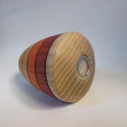Das Kaleidoskop mit dem gedrechselten Holzkorpus stammt aus der Kreiselmanufaktur Mader. Es wird aus Eschenholz gefertigt und hat ca. 5cm Durchmesser und 6,5cm Höhe.