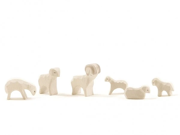 6 Krippenfiguren von Ostheimer. Die „Minis“ werden als Set in einer Geschenkbox aus Holz mit Holzwolle geliefert.