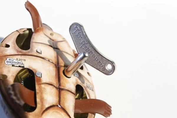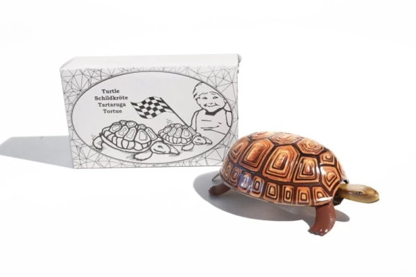 Schöne Blechspielzeug Schildköte mit braunem Panzer. Die Schildkröte wird auf der Unterseite mit dem beiliegenden Schlüssel aufgezogen und watschelt dann mit ihren 4 Füßen schön behäbig über den Tisch