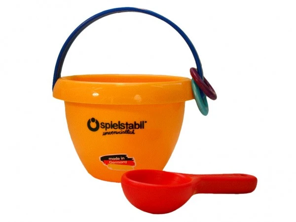 Der kleine Sand-/Wassereimer ist aus einem elastischem Material, hat ein Fußrelief im Boden und lustige Klapperringe am Henkel. Mit dem runden Löffel können die Kleinen leichter und gefahrloser hantieren als mit einer Schaufel.Der Babyeimer hat einen Durchmesser von 12cm und wird somit vollgefüllt auch nicht zu schwer.