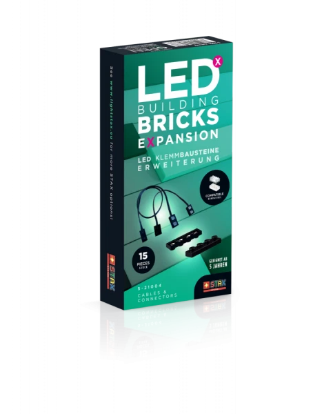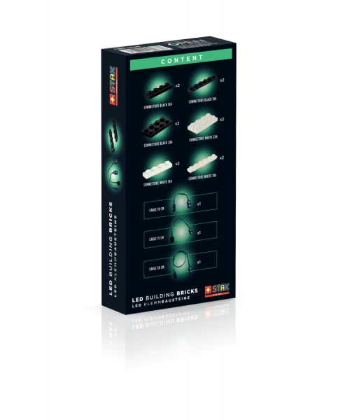 Das Stax System Set Expansion Cables & Connectors enthält 15 Teile mit denen man seine Klemmbaustein-Konstruktionen erweitern kann. Benötigter „Mobile Power Brick“ oder „USB Charging Brick“ ist in diesem Set nicht enthalten. Inhalt: 2 Stück Connector Schwarz 1×4 2 Stück Connector Schwarz 1×6 2 Stück Connector Schwarz 2×4 2 Stück Connector Weiß 1×4 2 Stück Connector Weiß 1×6 2 Stück Connector Weiß 2×4 1x Kabel 10cm 1x Kabel 15cm 1x Kabel 30cm